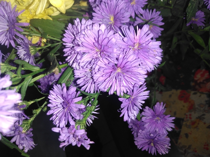A close-up image displays a dense cluster of small, vibrant purple flowers with numerous slender petals radiating from a central disc, consistent with aster-type blooms. Green stems and leaves are visible among the flowers. A small group of bright yellow flowers is partially discernible in the upper right background. The lighting emphasizes the purple flowers, creating a contrast with the dark, out-of-focus background in the upper and central-left areas. The lower-left portion of the background features a blurred, multi-colored patterned surface, possibly a textile, exhibiting yellow, orange, and red floral or abstract designs on a dark base. No people, animals, or specific actions are depicted. The scene is situated in Parroquia El Guapo, Venezuela.