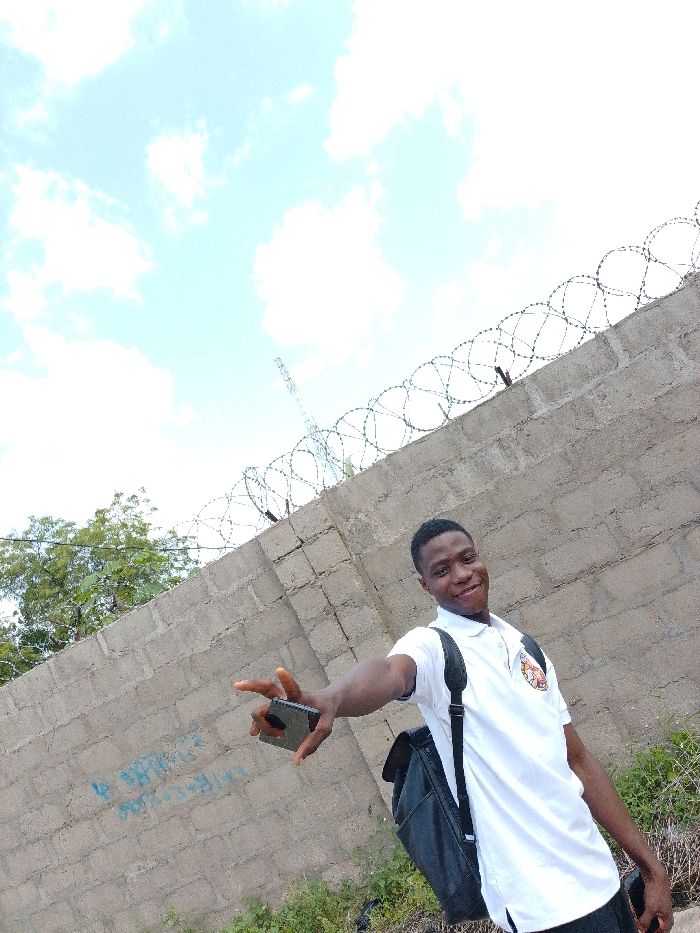 An outdoor, low-angle photograph depicts a young adult male standing in front of a concrete block wall under a bright sky with scattered clouds. The male, positioned in the lower right and center, has dark skin, short dark hair, and is smiling directly at the camera. He wears a white collared polo shirt with a graphic emblem on the right chest, dark trousers, and a black backpack strapped over his shoulders. His left arm is extended towards the camera, holding a black smartphone horizontally. His right hand is partially visible near his hip, possibly holding another object. The concrete block wall, topped with multiple coils of razor wire, extends diagonally from the lower left to the upper right. Faint blue graffiti is visible on the lower left section of the wall. Behind the wall on the left, green foliage from trees or bushes is visible. The ground at the base of the wall is overgrown with weeds and some scattered debris. In the far background, rising above the wall and razor wire on the left, a tall, slender lattice structure, consistent with a cell tower or antenna, is visible against the sky. The location is an unidentified outdoor urban or semi-urban setting within Unknown, Unknown.
