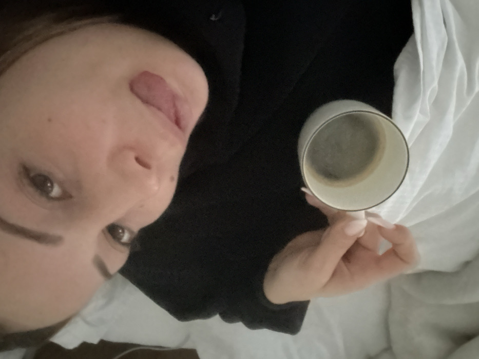 A single adult female is depicted in a high-angle, close-up indoor shot, located in Hem, France. She has fair skin, brown eyes, and brown hair, partially visible. Her facial expression features an open mouth with her tongue extended. She is attired in a dark, long-sleeved garment. Her left hand, with light-colored manicured nails, holds a white cylindrical mug with a dark rim, containing a dark liquid with a lighter, frothy surface layer. The subject is positioned against and partially covered by white bedding, including a white pillow visible behind her head. The environment is uniformly lit with soft illumination.