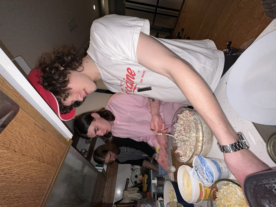 Three individuals are preparing food in a kitchen. One person, wearing a white t-shirt and red cap, looks down at the food preparation. Another person in a pink shirt mixes salad in a glass bowl with a spoon, while the third person in a gray shirt is doing something in the lower part of the scene. Various food items, containers, and utensils clutter the counter. The setting appears to be a casual, home kitchen environment.