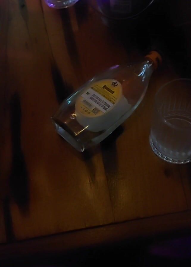 A bottle of clear liquid, possibly alcohol, lies on a wooden table. There are a few empty glasses, an ice bucket, and other unidentifiable objects on the table as well. There is some type of music or performance playing in the background. The room seems dimly lit, with a blue spotlight shining briefly on the table.
