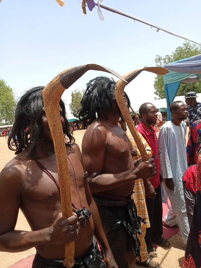 The scene takes place outdoors in a community gathering in Zum, Nigeria (latitude: 10.116, longitude: 13.046). Two shirtless men are standing in a line of other men, holding large, curved wooden staffs with metal tips. The man on the left has his staff resting against his shoulder and is wearing a thin, dark strap around his neck with a small, beaded pendant hanging from it. He is wearing a dark belt with a large, black object attached to it. The man on the right is holding his staff in front of him with his right hand. He is also wearing a dark belt. Both men are wearing black fabric wrapped around their waist and legs. They have long, black hair, and their skin is tanned from the sun. The men behind them are wearing various colored clothing, including plaid shirts, long-sleeved white shirts, and a blue and white patterned robe. The ground is dry and dusty. The setting suggests a social or celebratory occasion.