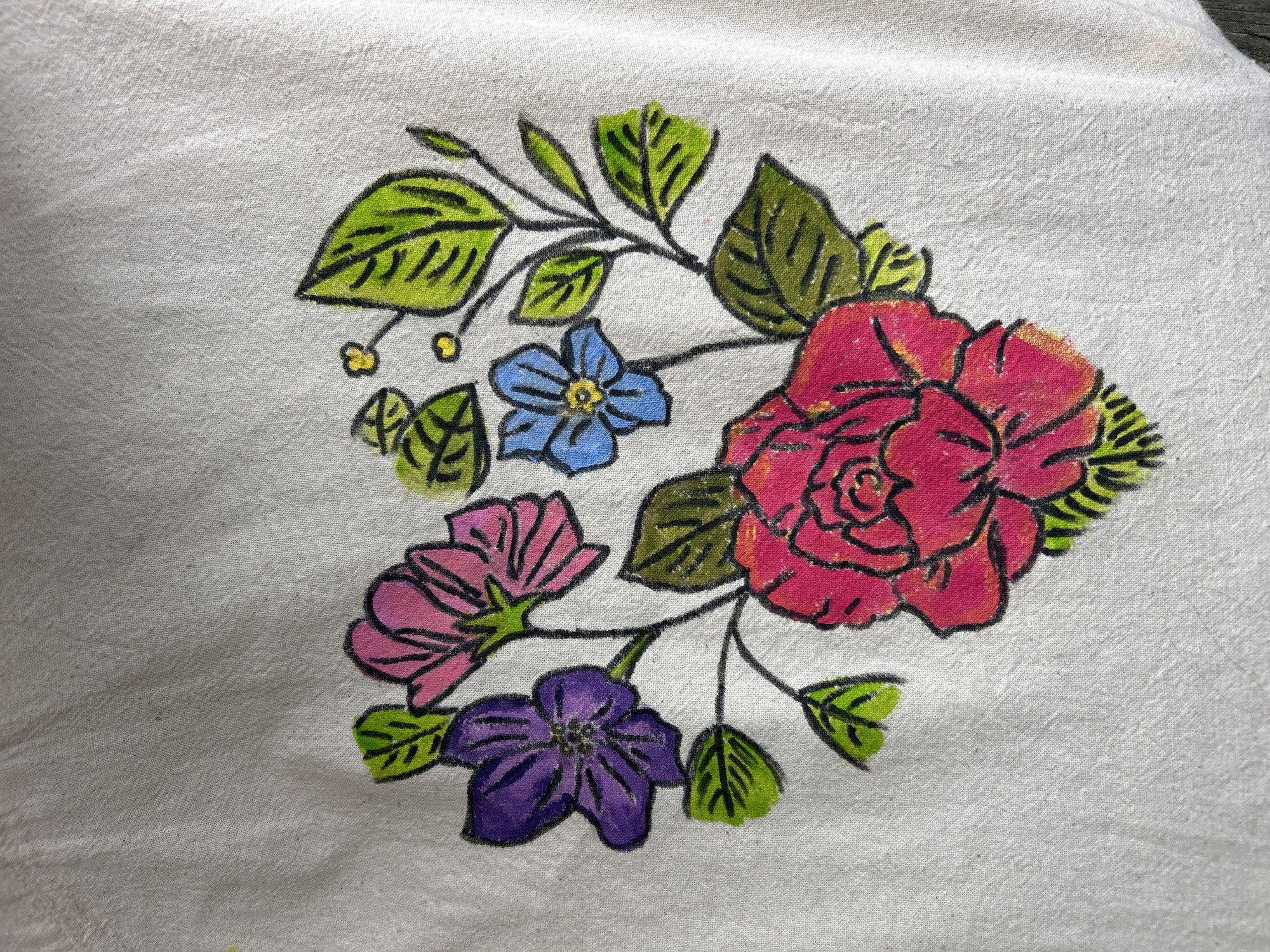 floral design, possibly painted or drawn, on a light-colored fabric. The design includes a pink rose, a blue flower, a purple flower, a pink flower, green leaves, and yellow berries. The flowers and leaves are outlined in black. The fabric appears to be slightly wrinkled. The location is not apparent from the image and cannot be determined to be Varna, Bulgaria.