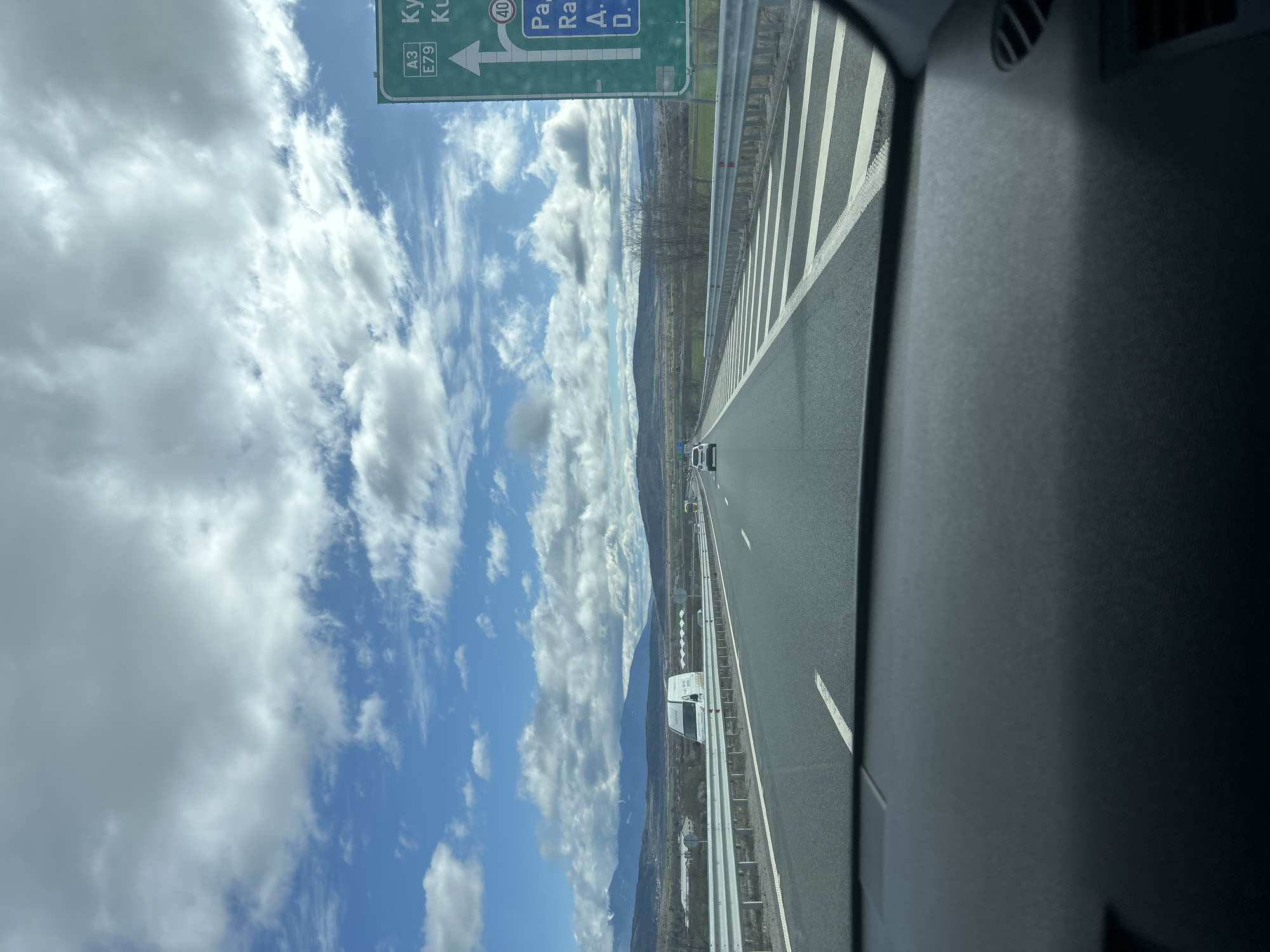 The image depicts a view from inside a vehicle traveling on a highway. The highway is marked as A3 and E79 based on the road sign visible, which also indicates the exit towards Dolna Dikanya, Bulgaria. The sky is visible with scattered clouds. The road is bordered by guardrails. Other vehicles are also on the highway. The interior of the vehicle is partially visible.