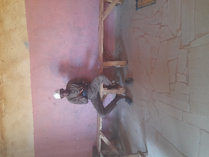 An indoor scene in Akwanga, Nigeria, features an adult male seated on a rustic wooden bench