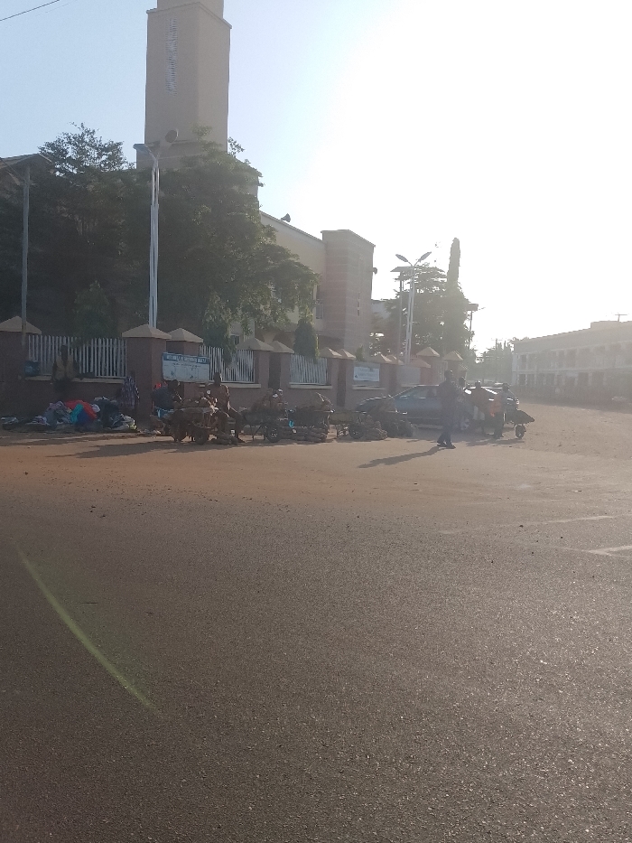 The image displays an outdoor urban street scene on a bright, sunny day in Barnawa, Kaduna State, Nigeria, specifically in front of All Saints Parish Catholic Church