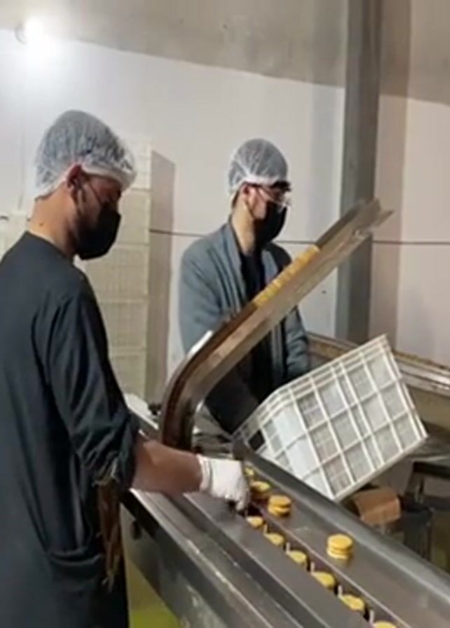 Inside a brightly lit factory, workers assemble sandwich cookies on a conveyor belt