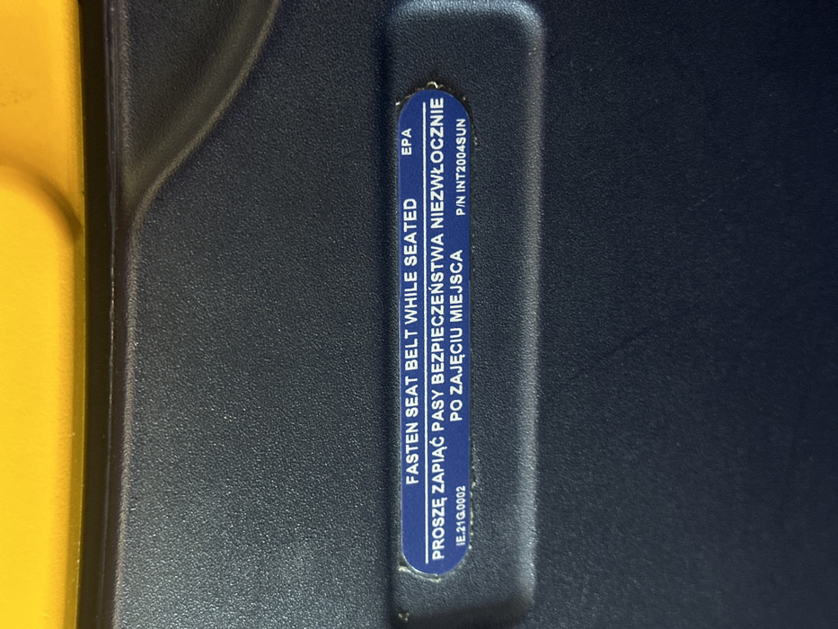 The scene depicts a close-up view of an informational label affixed to a dark gray, textured plastic surface, likely a seatback or tray table within an aircraft. The label is rectangular with rounded corners, blue in color, and displays white text in both English and Polish. The English text on the top line reads: "FASTEN SEAT BELT WHILE SEATED" followed by "EPA". The Polish text on the second line reads: "PROSZĘ ZAPIĄĆ PASY BEZPIECZEŃSTWA NIEZWŁOCZNIE PO ZAJĘCIU MIEJSCA" (Please fasten seat belts immediately after taking your seat). Below the Polish text, smaller alphanumeric codes are visible: "IE.21G.0002" on the left and "P/N INT2004SUN" on the right. Above the dark gray surface, a bright yellow, slightly curved object is partially visible at the top of the frame, possibly another part of the aircraft interior or another seat component. No individuals or active interactions are present. The environment is an interior space. Given the nature of the warning in English and Polish, this scene is located within a passenger aircraft at Warsaw Modlin Airport (WMI) in Nowy Dwór Mazowiecki, Poland.