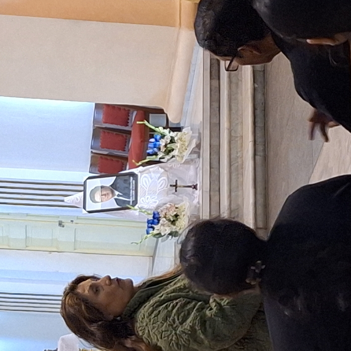 A photo shows people gathered around a framed photo and flowers, likely at a memorial service. A woman in a green sweater is visible on the left, seemingly speaking. To the right, people in black attire are seen, their faces partially obscured. The framed photo depicts a man in a suit. A white cloth adorned with a cross lies next to the picture, adding to the somber atmosphere. The setting appears to be indoors, possibly a church or chapel.