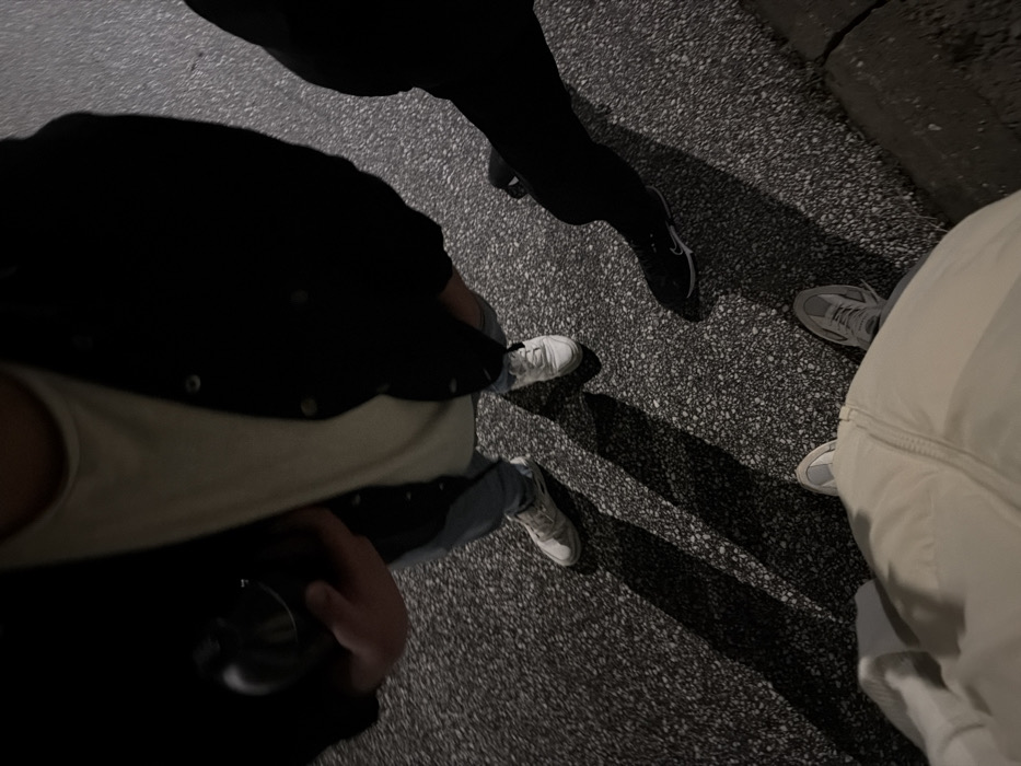 Three individuals are captured from an overhead perspective on a speckled asphalt surface in Grohotno, Bulgaria. The scene is dimly lit, casting long, distinct shadows, suggesting nighttime conditions under an artificial light source. One individual, positioned at the top-left and center, wears a black jacket over a light-colored shirt, blue jeans, and white athletic shoes. This individual is holding a dark, spherical object in their left hand, partially obscured by their body. A second individual is visible on the right side of the frame, showing only their lower body. They wear dark-colored pants and black athletic shoes with white accents. The third individual is positioned at the bottom-center of the frame, visible from the torso down. They are wearing a light-colored, possibly beige or off-white, puffer jacket and grey athletic shoes. The perspective of the camera appears to be held by this third individual.