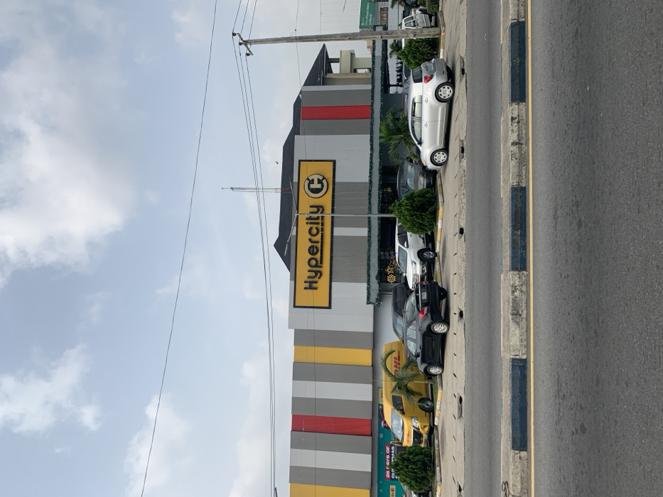 The scene depicts the exterior of a Hypercity C retail establishment in Rumuepirikom, Nigeria, observed from across a multi-lane asphalt road