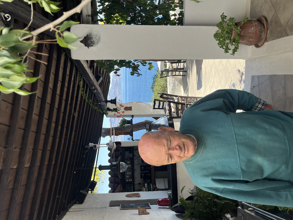 - "The image depicts an elderly bald man with fair skin and red blotches on his scalp, wearing a teal-green long-sleeved sweatshirt over a plaid shirt, standing on a tiled patio in what appears to be an outdoor restaurant or cafe" by FM-CRvhO2, licensed under CC BY 4.0