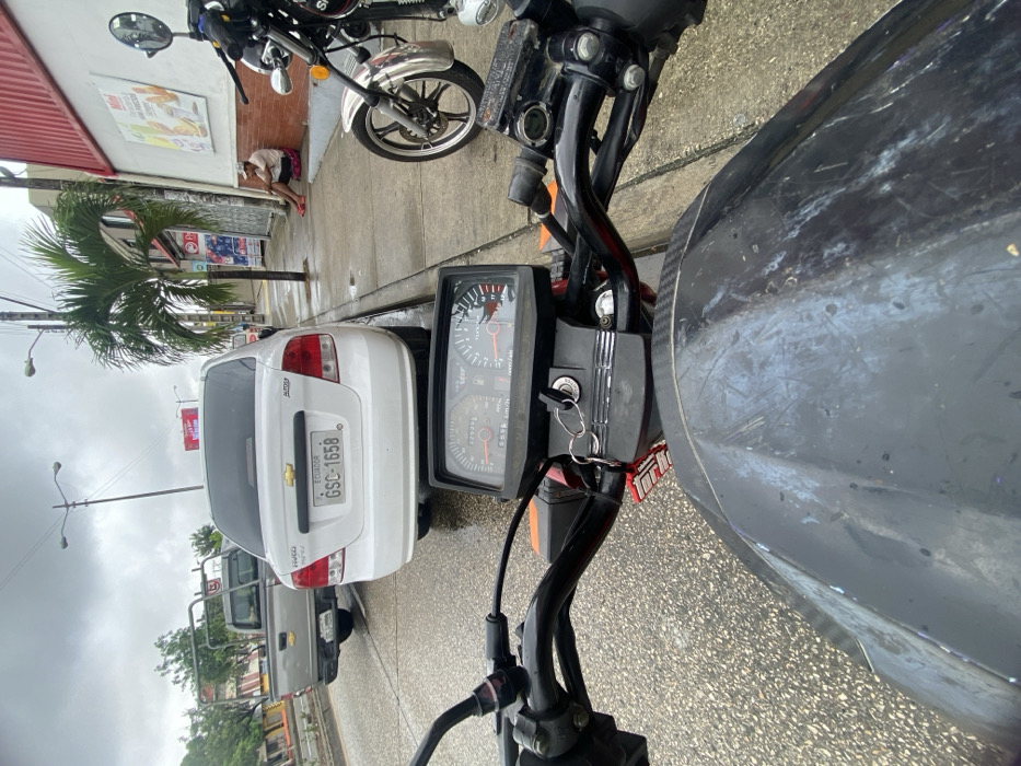 A first-person view from a motorcycle shows the handlebars and instrument panel, with a key in the ignition. A white car, possibly a Chevrolet, is parked in front, displaying license plate "GSC-1658" from Ecuador. Behind the car, a pickup truck is also parked. Another motorcycle is partially visible on the left side of the image. In the background, a palm tree stands near a storefront. The setting appears to be a rainy day on a street.