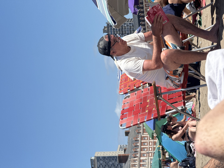 At a beach, a man sits in a red folding chair, reading a book. He wears a white shirt, patterned shorts, glasses, and a cap. Behind him, buildings rise along the shoreline. Other beachgoers are visible, including a woman in a bikini under a blue umbrella. The sky is clear blue.