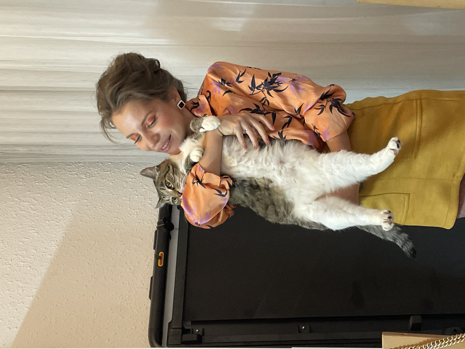 A woman holds a grey and white cat against her chest. She wears an orange floral blouse and a yellow skirt. The cat looks to the left. The woman looks at the cat and smiles. The background includes a white wall and a black object with yellow accents. The picture is rotated sideways.