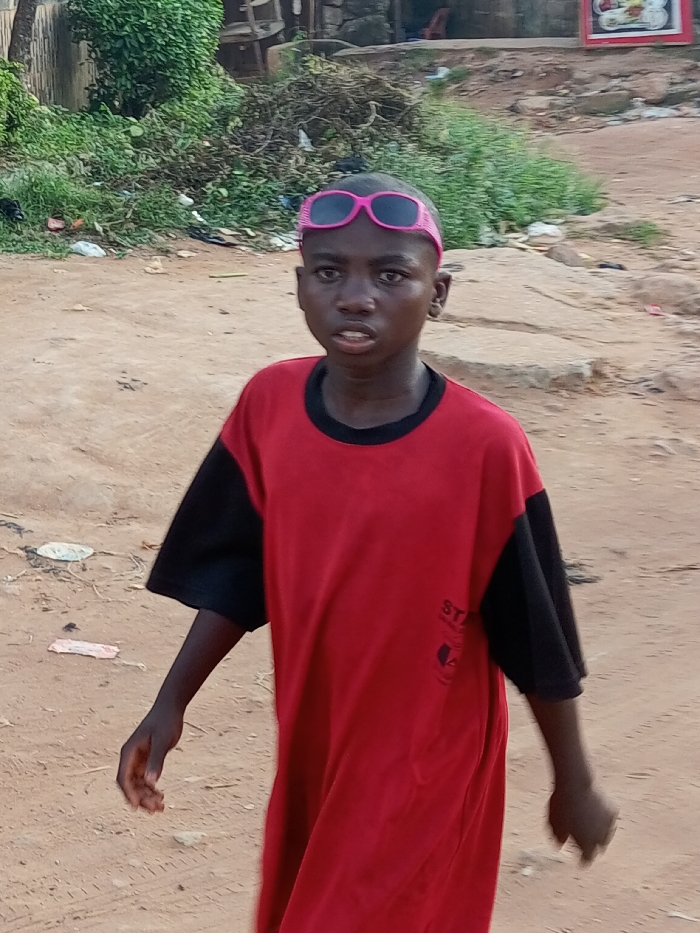 This image depicts a young Black male walking forward on an unpaved, reddish-brown dirt path in Obosi, Nigeria