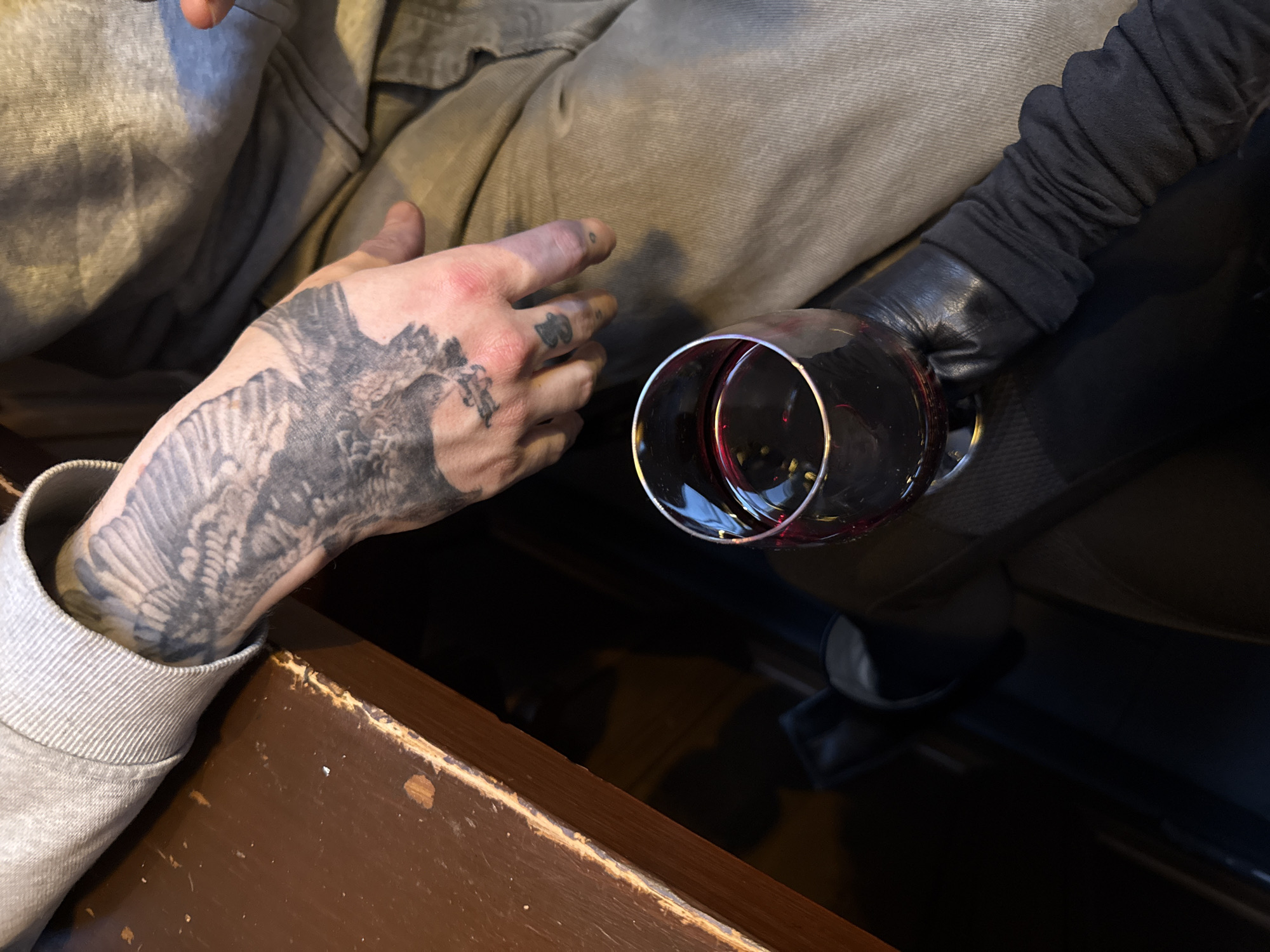 two individuals, one with a prominent tattoo of a bird on their forearm and hand, seated at a dark brown wooden table. The second individual, wearing a long black glove, holds a red wine glass containing liquid. The table is distressed, with chipped paint. The subjects appear to be indoors, possibly in City of Edinburgh, United Kingdom, given the prompt's requirement.