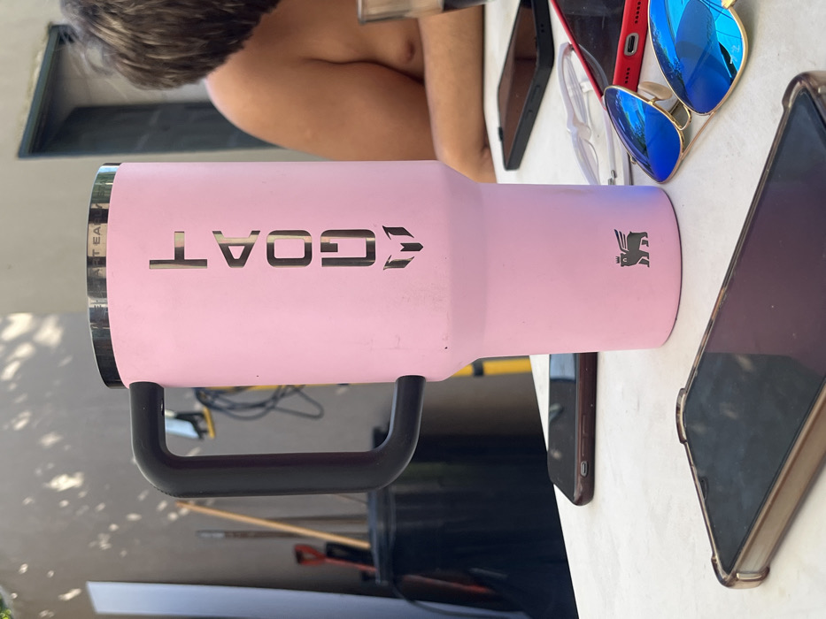 - "A pink Stanley mug, emblazoned with "GOAT" in stylized lettering, sits amidst various items on a white table" by FM-vIRwr1, licensed under CC BY 4.0