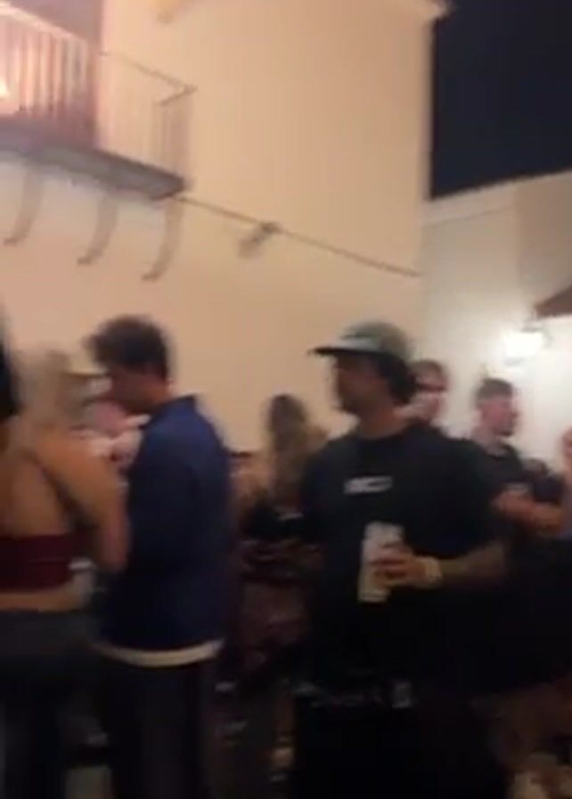 group of people gathered in what appears to be an outdoor alleyway at night. The alleyway is defined by white buildings with dark rooftops. People are talking and standing in small groups. Some are holding drinks. The lighting is dim, and there's movement and conversation among the crowd. Some are wearing dark clothing. One person has a blue shirt with a sunflower design on the back, and another wears a light-colored cap.