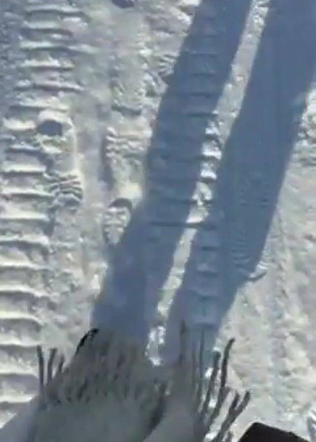 first-person view of someone walking on a snow-covered road or path