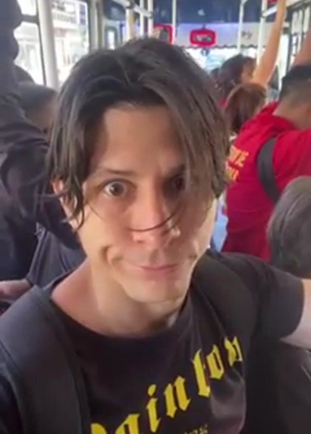 A man with dark hair and a black "Rainbow Rising" t-shirt stands on a crowded bus. He looks directly at the camera with a slightly amused expression. People stand around him, some holding onto rails. The bus's interior is visible, including the ceiling and windows showing outside scenery. The overall atmosphere suggests a busy public transportation ride.