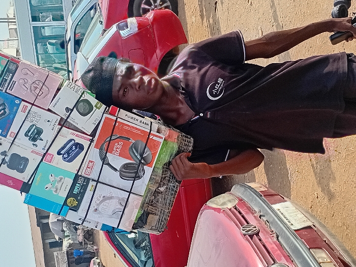 A young man carries a large bundle of boxed electronics, including headphones and power banks. He wears a dark shirt with a logo and a black cap. Cars surround him, with red vehicles appearing prominently in the foreground and background. The scene appears to be an outdoor market or roadside. The man's dark complexion contrasts with the bright boxes.