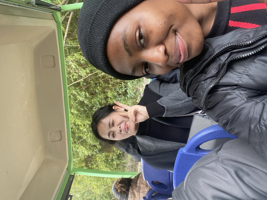 Two individuals are seated on a train-like vehicle, possibly a tram or tour ride. One, wearing a black beanie and a dark jacket, is positioned closer to the camera, their face prominent. The second person, seated behind, is making a peace sign with a playful expression, sticking out their tongue. Both appear to be enjoying themselves outdoors, with foliage visible in the background, suggesting a park or zoo setting. The interior of the vehicle is partially visible, with the sides appearing green and the seating blue.