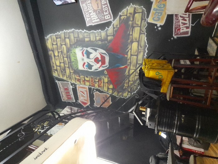 A wall mural dominates the scene, portraying a clown-like figure emerging from a brick wall, surrounded by various food-related signs. Below, a staircase with decorative iron railings is visible. In the foreground, a white appliance or furniture piece is partially captured. To the right, a wooden shelving unit holds a yellow box and other items, partially obscured by a black barrel. The overall setting appears to be a commercial or entertainment venue with artistic decor.