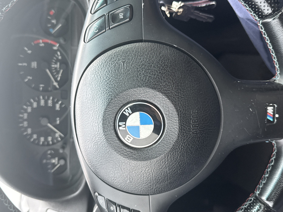 The image captures the interior of a vehicle, specifically a black steering wheel and a portion of the instrument cluster, from the driver's perspective