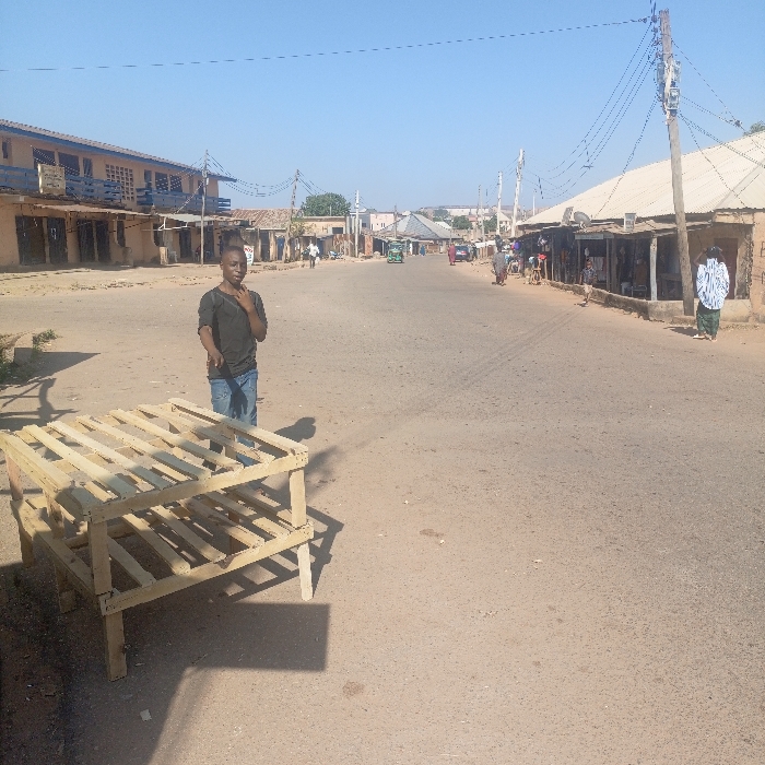 The image depicts an outdoor street scene in the city of Unknown, Unknown, under a clear blue sky. In the foreground, a light-colored wooden display stand or table with two slatted shelves is positioned on the left side of a light brown, unpaved or dirt-covered road, casting a shadow to its right. A young male individual, wearing a dark short-sleeved shirt and blue jeans, stands slightly behind and to the right of the wooden stand, with his left hand raised towards his chin. The wide, dusty road extends into the background, lined on both sides by buildings. On the left, a two-story structure with a faded blue upper facade and multiple closed openings is visible, followed by a single-story building with a corrugated metal roof. On the right, a series of single-story structures with corrugated metal roofs, likely shops or stalls, are present. Several wooden utility poles with numerous overhead wires are distributed along both sides of the road. In the midground, a green three-wheeled vehicle, possibly an auto-rickshaw, is visible on the road, moving away from the viewer. Several indistinct figures are seen walking or standing further down the road, particularly near the shops on the right. Another individual stands near the shops on the right, wearing a light-colored, vertically striped long shirt. The overall environment suggests a commercial or market area in a developing region. Shadows indicate direct sunlight.