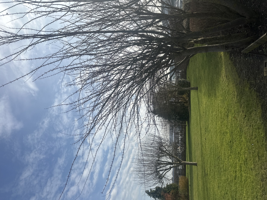 The scene depicts an outdoor park or garden area in Carvin, France, under a bright blue sky partially covered by scattered white cirrus or altocumulus clouds. In the foreground on the right, a cluster of mature deciduous trees with numerous bare, intricate branches extends upwards and leftwards across the frame, silhouetted against the sun. The ground directly beneath these trees is dark and shaded. The midground consists of an expansive, well-maintained green lawn, uniformly mown. Within the lawn, several individual, bare deciduous trees, appearing to be pruned or pollarded, are sparsely distributed, with one notably prominent on the left. The background features a dense line of evergreen hedges or shrubs forming a perimeter. Beyond these shrubs, indistinct structures, including what appears to be a building with a dark roofline, are visible on the distant horizon. The bare trees indicate late winter or early spring conditions. No individuals or specific activities are present within the captured image.