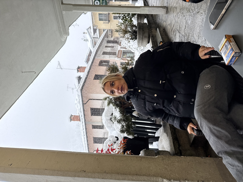 The image depicts an outdoor scene in Limone Piemonte, Italy, during a snowfall. A blonde female, with hair pulled back, is seated at a dark outdoor table, partially under a light-colored overhang. She wears a black puffer jacket with silver hardware and grey athletic pants featuring a white logo on the left thigh. Her gaze is directed upwards and slightly to the right, mouth slightly ajar. Her right hand grips a dark, rectangular object. On the table, to her right, rests a pack of Marlboro Mix 9 Rosso / RED cigarettes and a white-cased smartphone. A light-colored stone pillar borders the left side of the frame. Outside the overhang, snow is actively falling and has accumulated on the ground, various shrubs, and potted plants, which display some red foliage. The ground appears wet and slushy. In the midground, several multi-story buildings with traditional architecture are visible, their terracotta-tiled roofs and chimneys covered in snow. One building exhibits a pinkish-orange facade. A green circular sign partially visible on the right indicates "ETTERIA," with "FRUTTA & VERDURA" and "ROMA" below. The sky is overcast. Another individual, partially visible on the far right, wears an orange and black jacket.