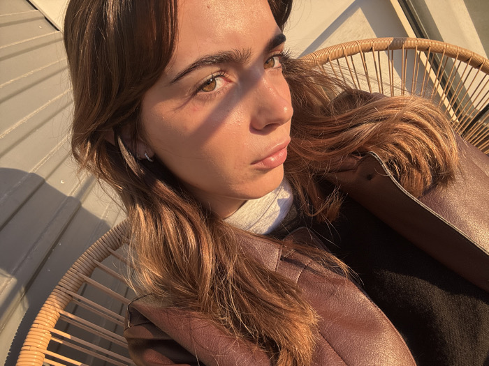 An image taken in Loures, Portugal, depicts a young female individual from the chest up, seated outdoors in a light-colored wicker chair. The subject has medium-brown hair with bangs, brown eyes, and fair skin, illuminated by strong, warm-toned natural light originating from the right side of the frame, casting shadows across the left side of her face. She is wearing a brown leather-like jacket over a white garment, which is layered above a dark-colored garment. A small, possibly silver-colored earring is visible in her left ear. Her gaze is directed straight towards the camera. The background consists of a light-colored slatted structure, possibly a wall or window blind, upon which distinct linear shadows are cast, indicating a low sun angle.