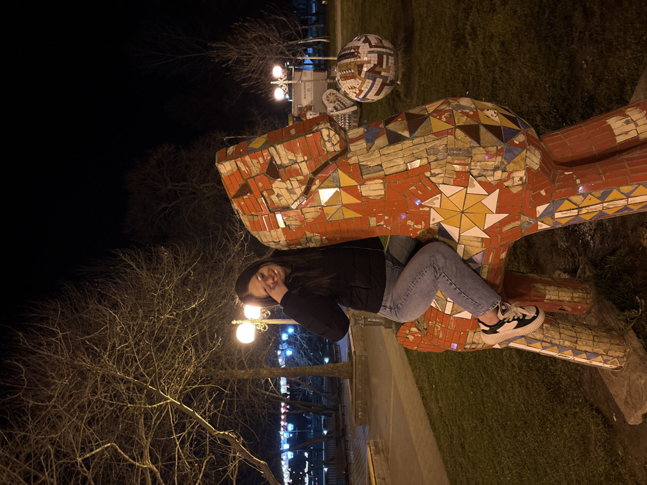 A young female is depicted seated on a mosaic horse sculpture at night, located in the Square of Arts in Pernik, Bulgaria. The female, wearing a black puffer jacket, light blue jeans, and black and white sneakers, has long dark hair and glasses. She faces the camera, smiling, and displays a two-finger 'V' gesture with her right hand near her face. The horse sculpture is constructed from multicolored ceramic tiles, predominantly red, yellow, blue, and white. To the right of the horse, a large, tiled spherical sculpture is visible on the grass. The scene is illuminated by warm yellow streetlights. Bare deciduous trees are present in the background, alongside paved walkways and distant city lights, some with a blue hue. A faint sign reading "МАГАЗИН" (shop) in Cyrillic is visible in the far background.