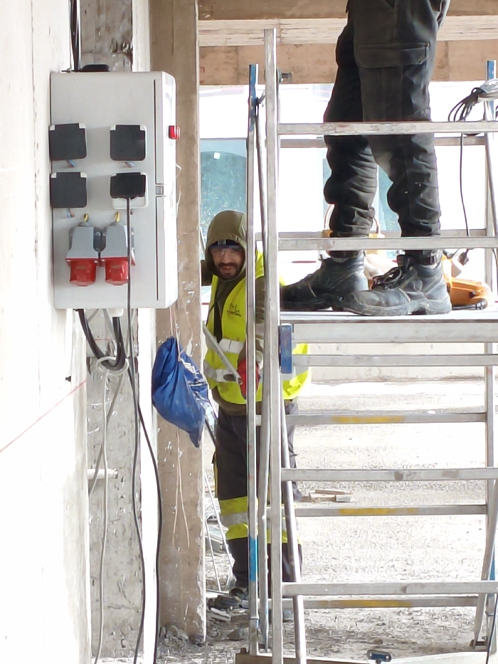 Two construction workers are present. One stands on a ladder, wearing dark work boots, dark pants, and a dark upper garment. The other is at ground level, wearing a hooded sweatshirt, safety vest, and dark pants with reflective stripes. A white electrical box with black and red outlets is attached to a wall. Cables and a blue bag hang nearby. The background shows elements of a construction site.