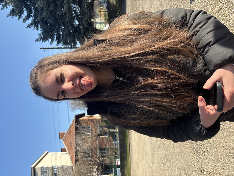 The image displays a young female, approximately late teens to early twenties, centered in the frame. She has long, straight, dark brown hair, extending past her shoulders. She wears a black puffer jacket, partially unzipped. Her face is turned slightly towards the viewer, with her right eye closed in a wink and her tongue extended, indicating a playful or humorous expression. Visible acne is present on her cheeks and forehead. Her left hand holds a dark-colored smartphone, possibly an iPhone, with her right hand supporting it from underneath; her fingernails are painted a light peach or pink hue. The subject stands outdoors on a light brown, unpaved surface, appearing gravelly. The background features a clear, bright blue sky. To the left, a light-colored, multi-story residential building is partially visible behind a distinct two-story brick house with an orange-tiled gabled roof and two prominent brick chimneys. Several leafless deciduous trees are scattered in the mid-ground. To the right, a large, dark green conifer tree stands prominently. Horizontal power lines are discernible in the mid-distance. The scene is brightly illuminated by direct sunlight, casting shadows to the left, indicating the sun's position. This residential urban environment is located in Cherven Bryag, Bulgaria.