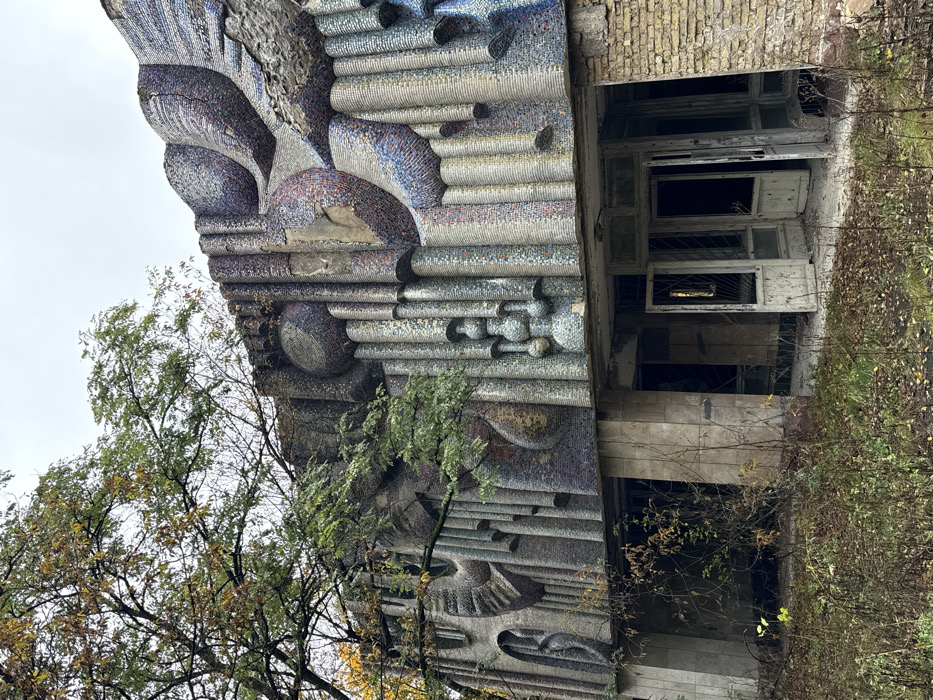 This image depicts the facade of the Polissya Hotel in Prypiat, Ukraine