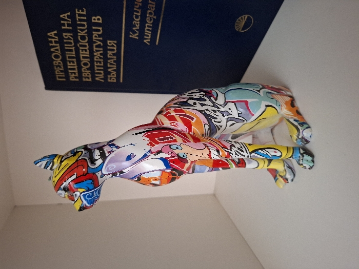 An art-styled cat statue sits prominently on a white surface within an interior setting in Nova Zagora, Bulgaria