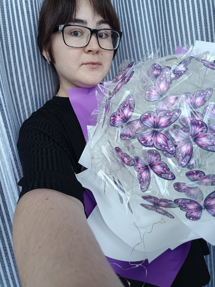 A young adult female, with short dark brown hair, bangs, light complexion, and freckles, wearing black-rimmed glasses and a black ribbed short-sleeved top, is depicted in an indoor setting in Posad, Russia. She is looking directly at the camera with a neutral expression. Her left ear displays a silver hoop earring. She holds a large, decorative bouquet-like object composed of numerous artificial purple and lavender butterflies with intricate white detailing, encased in transparent plastic wrap. This is layered over white and purple decorative paper. Fine string lights with small bulbs are intertwined within the lower portion of the butterfly arrangement. The person's right forearm is visible in the foreground, extending towards the camera, suggesting a selfie. The background features a vertical striped pattern, possibly a curtain or wall covering, in white and dark grey/black. The precise location within Posad, Russia, is not identifiable from the visual data.
