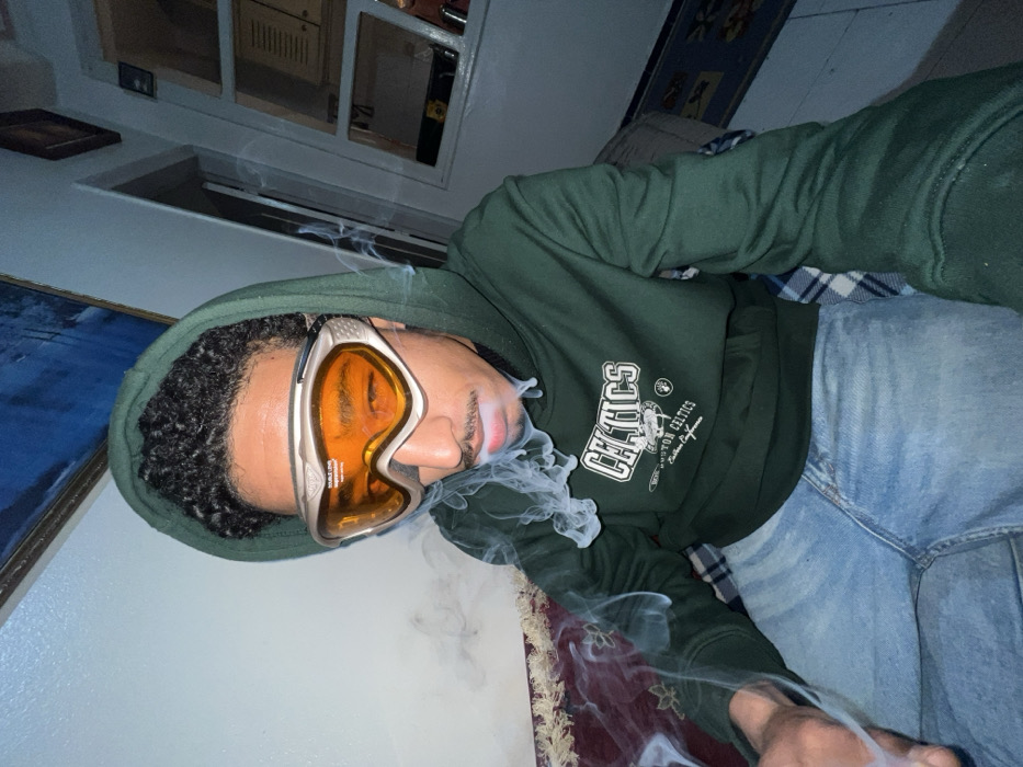 A single individual is depicted seated indoors in Tanger, Morocco. The subject is a young male, wearing a dark green hooded sweatshirt with a white "CELTICS" logo, light blue denim jeans, and silver-framed ski goggles with orange lenses. He has dark, curly hair visible under the hood and a mustache. The individual is actively exhaling white smoke from his mouth. The background features a light-colored wall. To the left, a traditional red and dark patterned rug or cushion is visible. Above, a framed artwork with predominantly blue and white elements hangs on the wall. To the right, a segment of a wooden frame, possibly a window or shelving unit, is partially visible. A blue and white patterned textile is beneath the subject's right leg. Artificial lighting illuminates the scene.