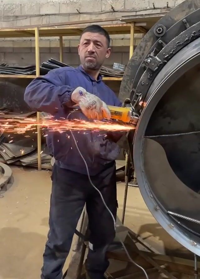 man in a work environment using an angle grinder on a large metal cylinder
