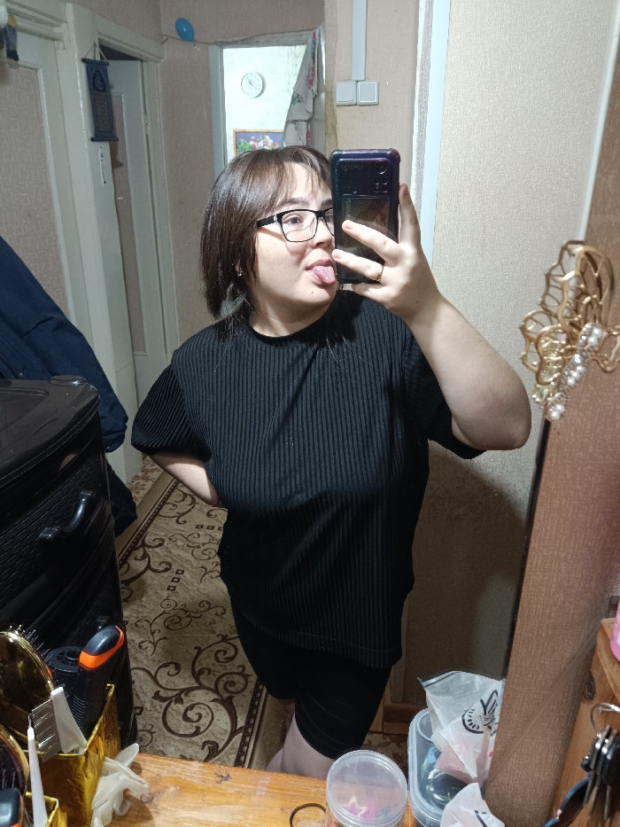 A woman with short brown hair and glasses takes a selfie. She wears a black ribbed t-shirt and black leggings. She sticks out her tongue. The woman is standing in front of a mirror, with a dresser and various objects in the foreground. The background reveals a doorway, and a beige and brown patterned carpet.