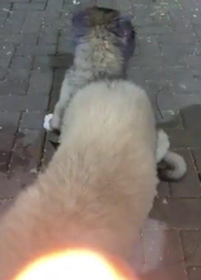 person standing outdoors on a brick surface, petting a dog. The dog is medium-sized with light brown fur and a darker, somewhat purple, top of its head. The person’s hand is visible petting the dog's back. The environment is dimly lit.