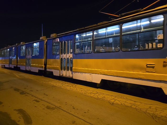 A multi-car tram, featuring a blue upper section, a yellow middle section, and a white lower chassis, is captured at night. The tram's interior is illuminated, revealing several indistinct figures, presumably passengers, through its rectangular windows. White, multi-panel doors are visible along the tram's side, separating sections. An orange pantograph extends from the tram's roof. The ground immediately adjacent to the tram is a dark, paved surface, possibly asphalt, exhibiting numerous cracks and some darker stains, illuminated by a strong yellow-orange artificial light source from an off-camera position. The background is dark and indistinct, consistent with an urban environment at night. The tram's livery (blue and yellow) is characteristic of public transport in Sofia, Bulgaria. No specific actions or interactions are clearly discernible, and the tram appears stationary or in slow motion.