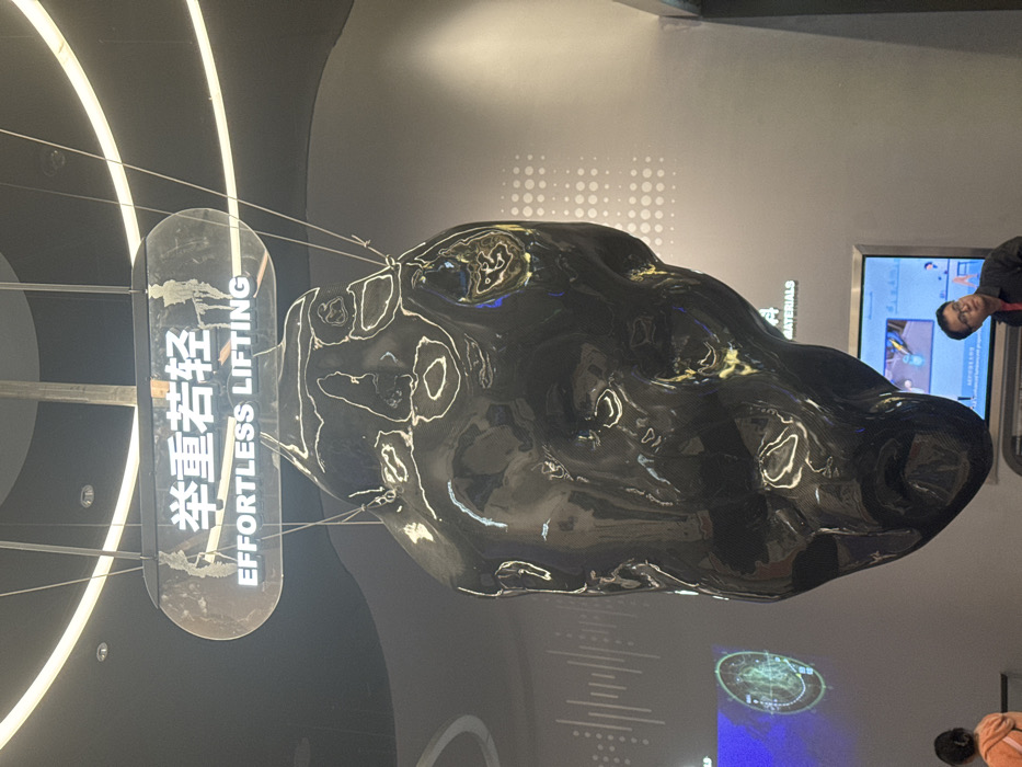 An irregularly shaped, large, dark, highly reflective sculpture is suspended from the ceiling in an indoor exhibition space in Guangming District, China
