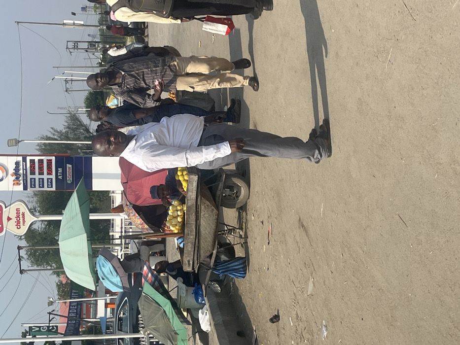 The image depicts a bustling roadside scene in Ikota, Nigeria, characterized by informal vending adjacent to a gas station under a clear, bright daylight sky