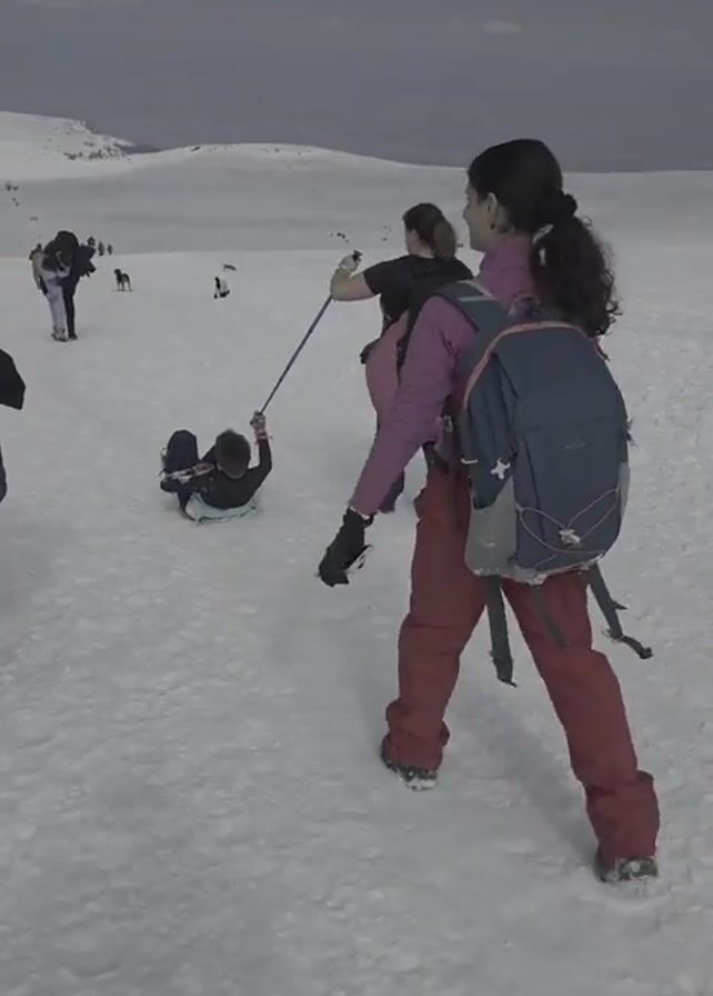 In a wide shot, a group of people are hiking through a snowy landscape. The sky is overcast. In the foreground, a woman with dark hair in a ponytail wears a pink jacket, red pants, and a blue backpack as she walks away from the camera. She is pulling a child lying on a sled with a pole. Next to her, another woman in dark clothing carries a pink coat. Further ahead, a man and a little girl are walking together. Several dogs are also present in the distance. The ground is covered in snow, with some exposed areas of darker ground visible. The background features snow-covered hills and mountains.
