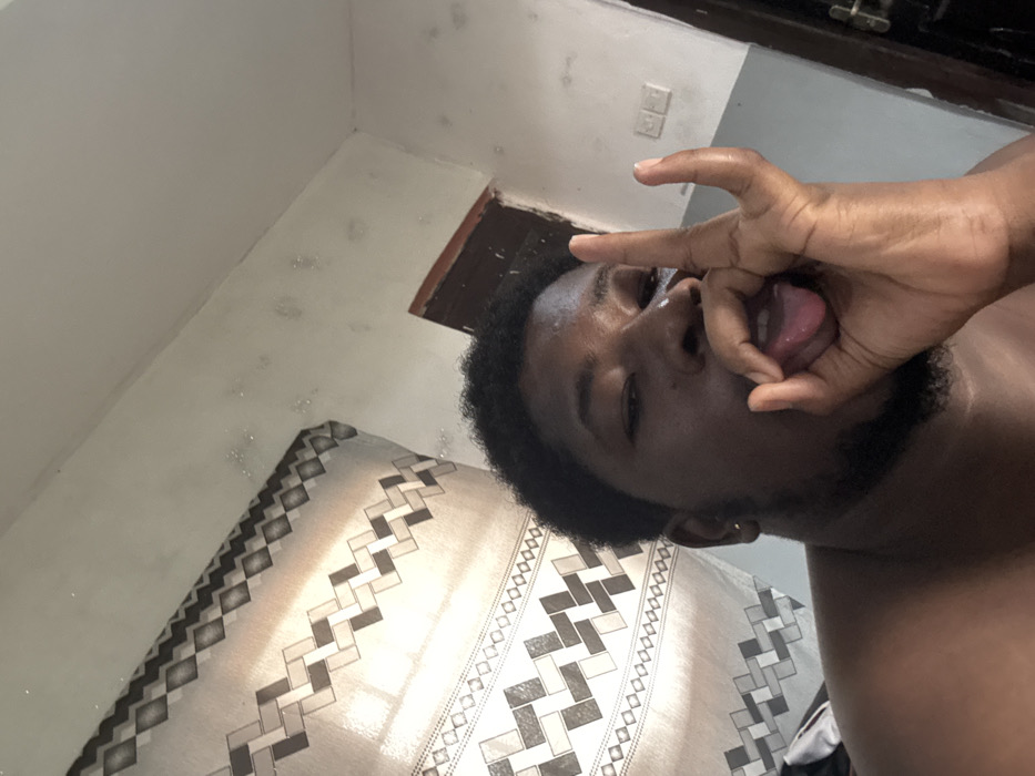 dark-skinned male subject, appearing to be in his 20s or 30s, with short, dark, curly hair and a dark beard, captured in a close-up, angled shot. The subject is shirtless and faces the camera, making a hand gesture with his right hand where the thumb and index finger form a circle while the other three fingers are extended upwards. His tongue is partially extended from his mouth. The scene is an indoor environment within a structure in Gbongan, Nigeria. In the background to the left, a window is partially obscured by a light-colored curtain featuring a repeating pattern of interwoven dark and light gray geometric shapes. The wall directly behind the subject is light-colored, exhibiting multiple small, scattered dark blemishes. To the subject's right, a dark brown vertical structure, possibly a door or window frame, is visible next to two white rectangular electrical light switches mounted on the light-colored wall.