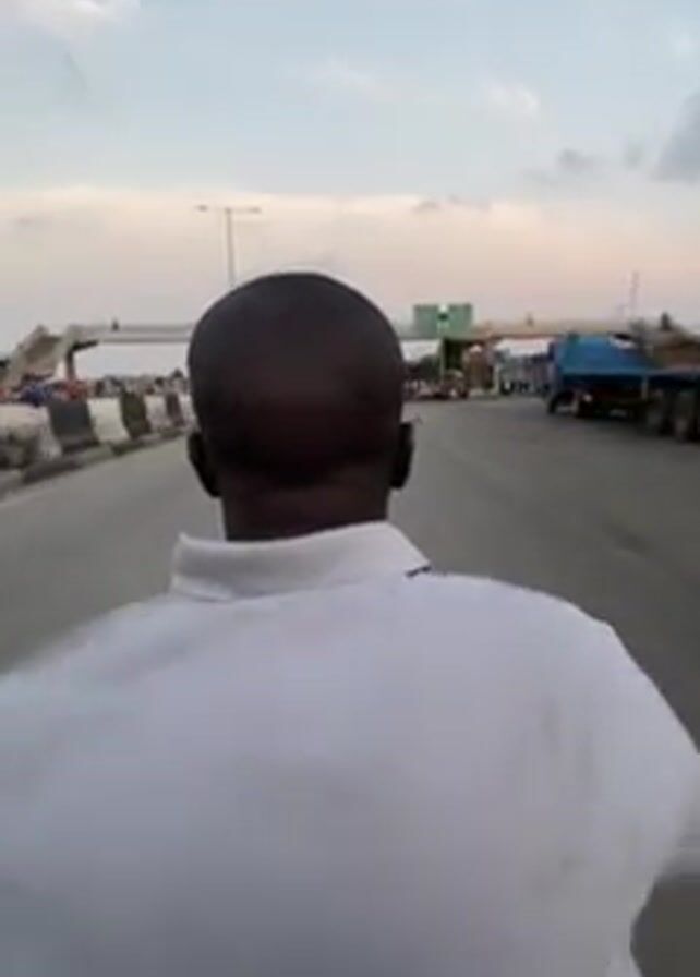 person, viewed from behind, wearing a white polo shirt and bald head, riding on a motorcycle. The motorcycle travels along an asphalt road lined by concrete barriers on the left and a sidewalk with people and parked vehicles on the right. An overpass crosses the road ahead. The sky is blue with light cloud cover.