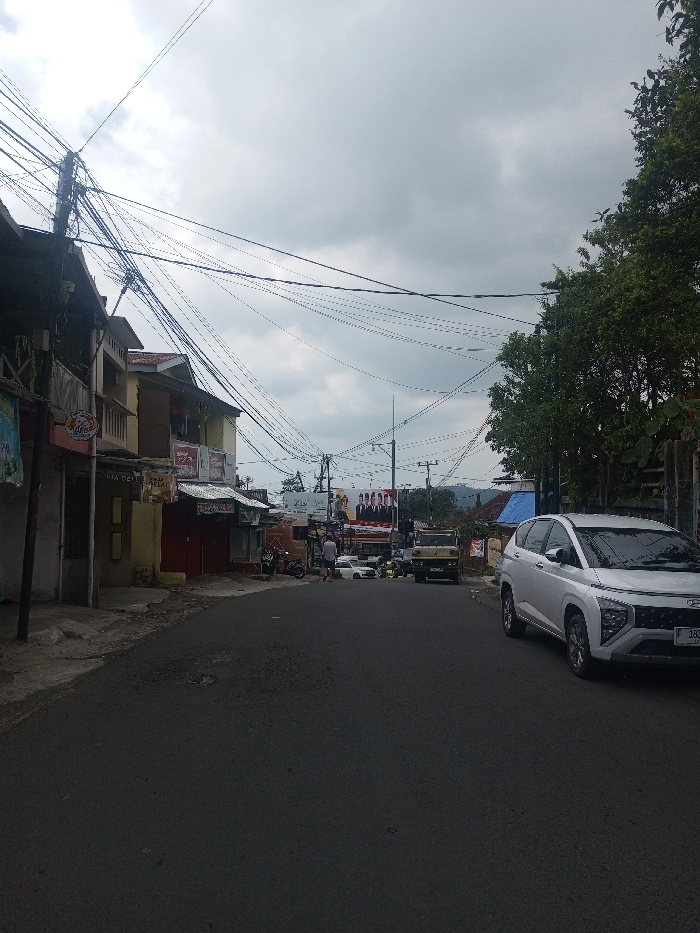 The scene depicts a street in Kalchini, India, under an overcast sky. The asphalt road occupies the foreground and middle ground, curving slightly to the right in the distance. On the left, a series of one- and two-story buildings line the street. These structures feature varied facades, some with closed ground-level storefronts indicated by dark or red roll-down shutters. Numerous tangled black electrical and communication wires crisscross overhead, originating from multiple utility poles, one prominently positioned in the left foreground. On the right side of the street, a silver Hyundai Stargazer SUV, bearing the license plate "F 1836 CFF", is parked facing away from the viewer. Behind it, a large, dense green tree extends upwards. Further down the street on the right, a section of a building with a blue tarp roof is visible. In the middle distance, at least two individuals are walking on the road, moving towards the camera. One person is wearing a light-colored shirt. Further down the street, a light-colored pick-up truck or utility vehicle is visible. A prominent billboard in the distance features an advertisement with five to six men in suits. Distant hills or mountains are discernible against the cloudy horizon.